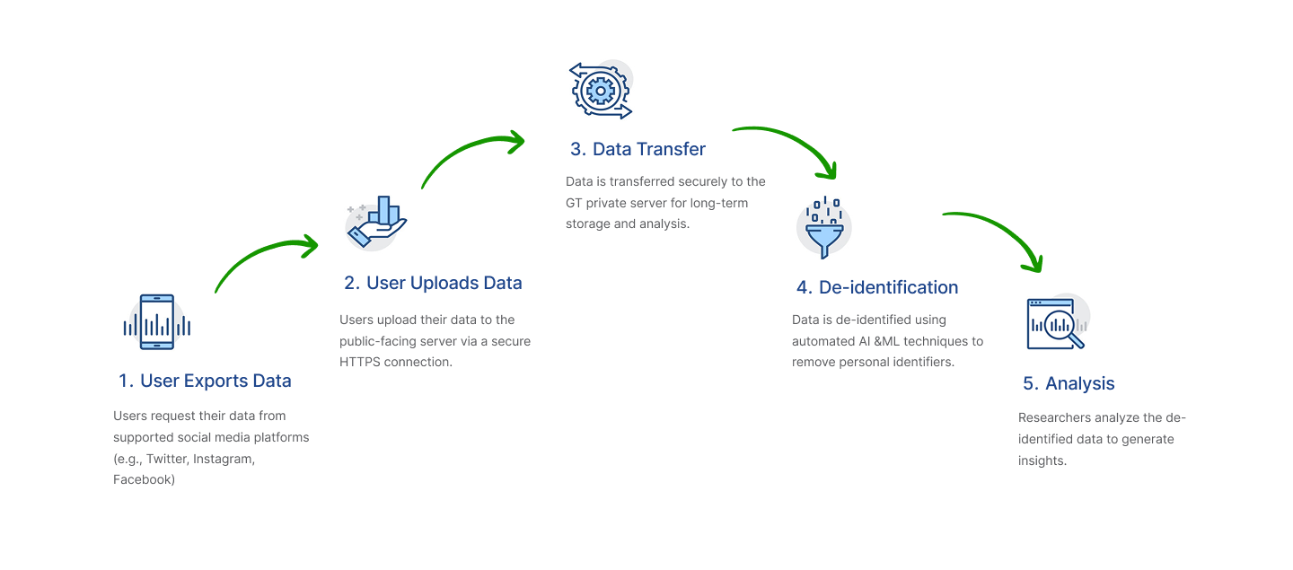 The CANDOR Data Donation Portal is a secure platform designed to collect and analyze social media data for research purposes. Users can upload their data from supported platforms like Twitter, Instagram, and Facebook. The system ensures privacy by de-identifying all data using advanced machine learning techniques. Data is stored and analyzed on Georgia Tech’s secure servers, accessible only to authorized researchers.